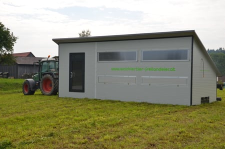 Der Stall wird von uns alle 7-14 Tage auf eine neue und frische Wiese versetzt. Auf diese Weise steht den Tieren immer ein